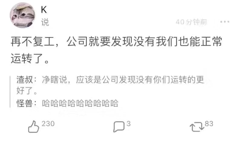 随着防控局势的升级,复工日从1月29日一步步推迟到2月3日、2月9日,有的地区还推迟到2月20日、3月1日。 一些自嘲的段子已经开始出现了。