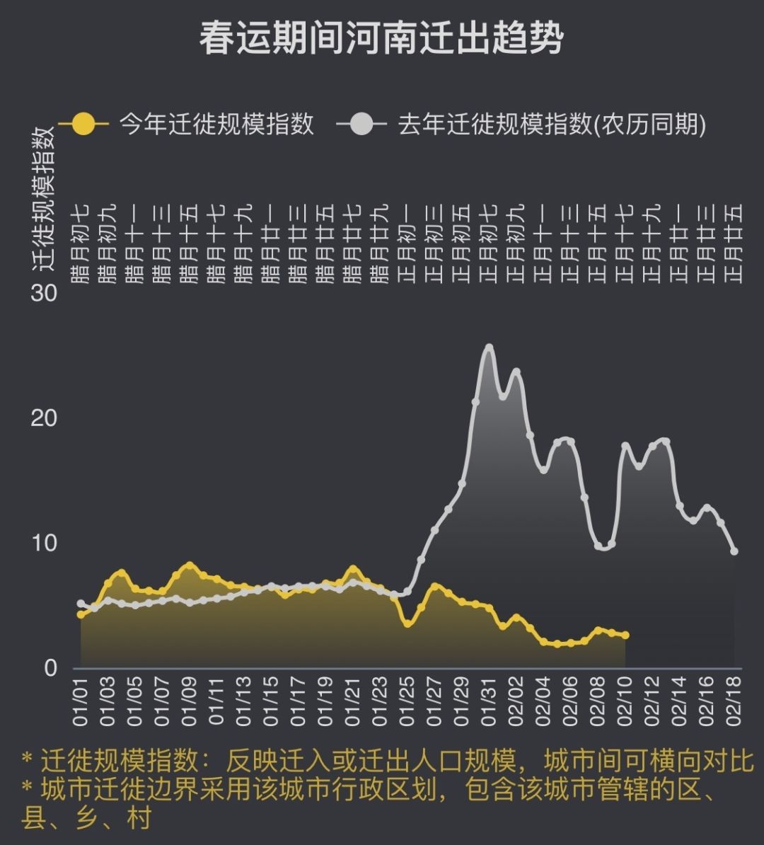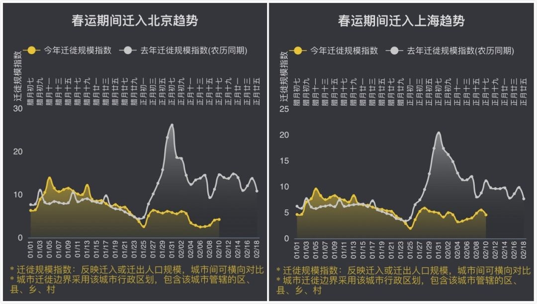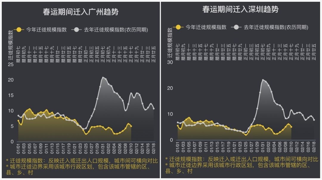 北京的返程人数可能是四座一线中最少的,而深圳高峰期的迁入指数还不到去年的一半。