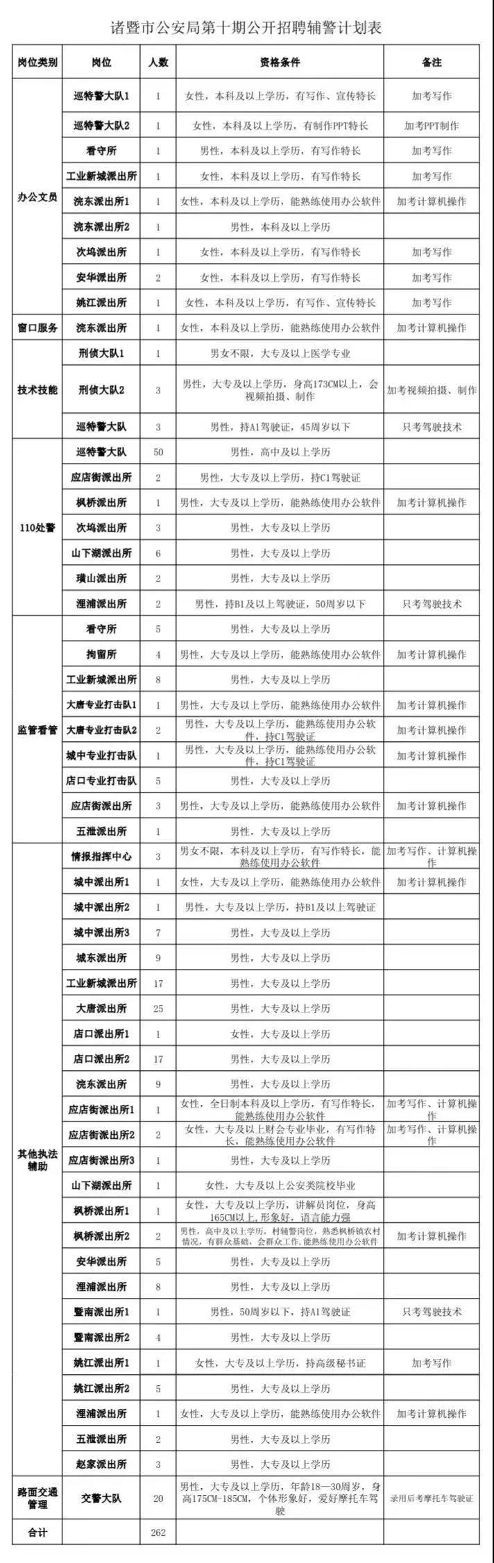 计划招聘辅警262人。具体岗位、招聘人数、资格条件详见《诸暨市公安局第十期公开招聘辅警计划表》(附件1)。
