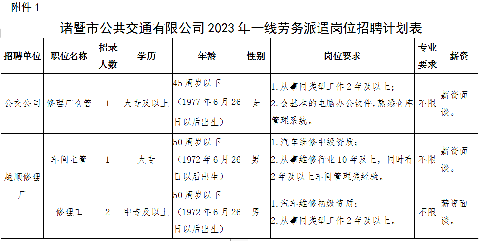 详见《诸暨市公共交通有限公司2023年一线劳务派遣岗位招聘计划表》(附件1)